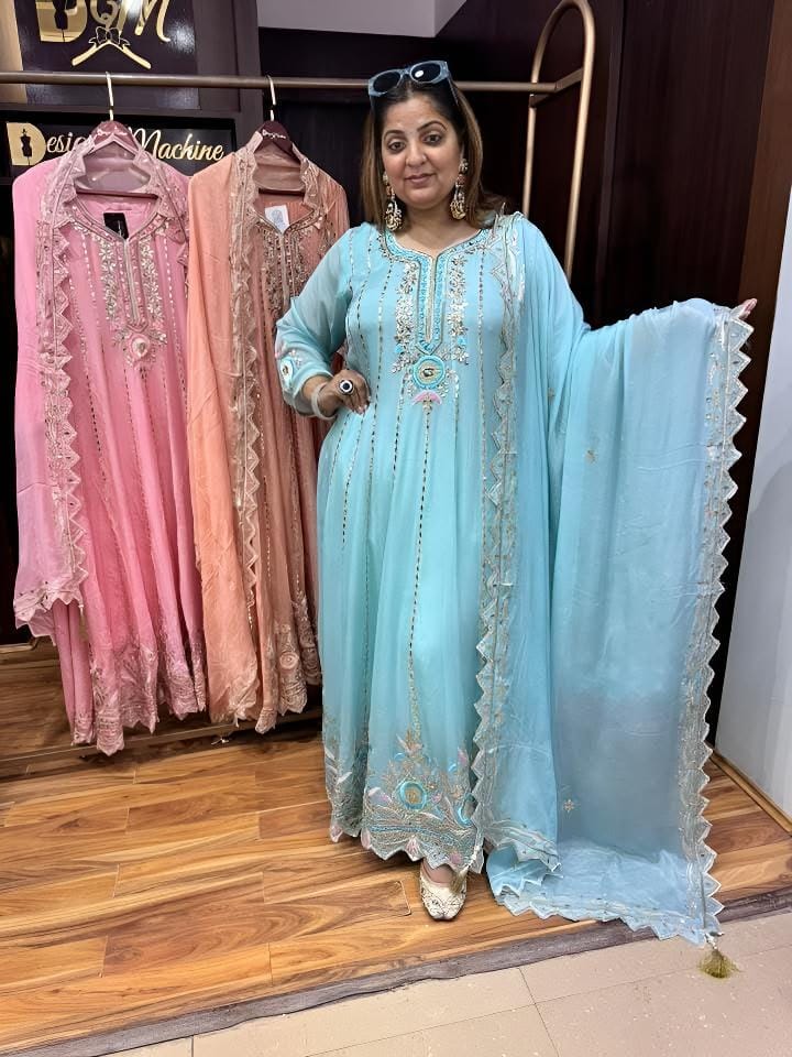The studio offers everything from couture bridalwear to pre-wedding photoshoot outfits, celebrity-styled collections, and custom made-to-measure designs. Her team includes skilled artisans who specialize in hand embroidery, zari work, mirror detailing, and fabric dyeing.